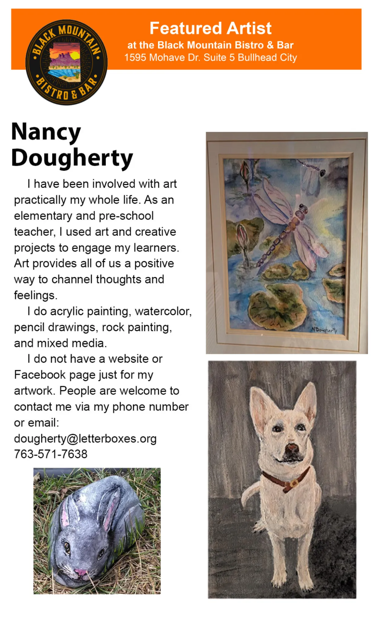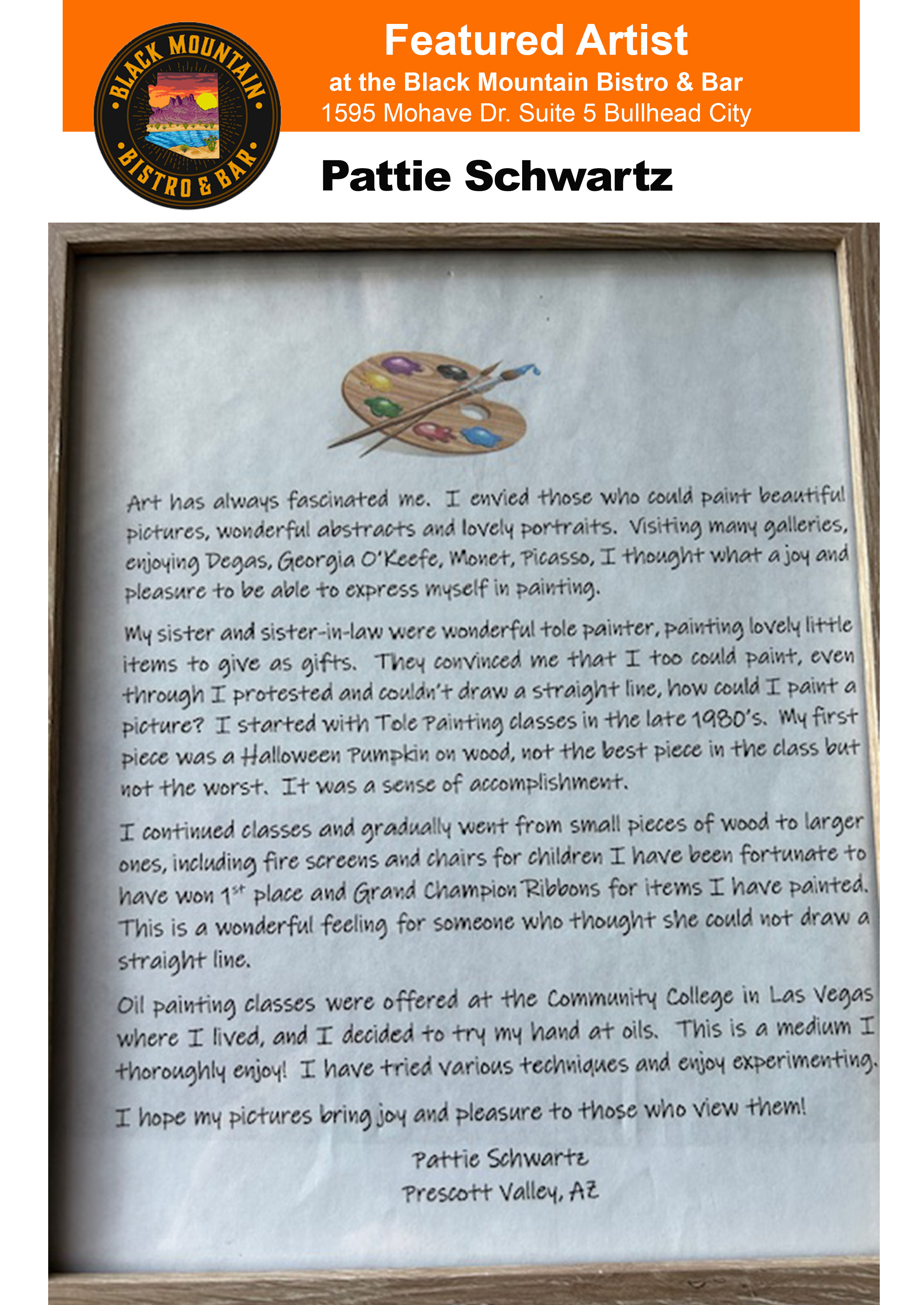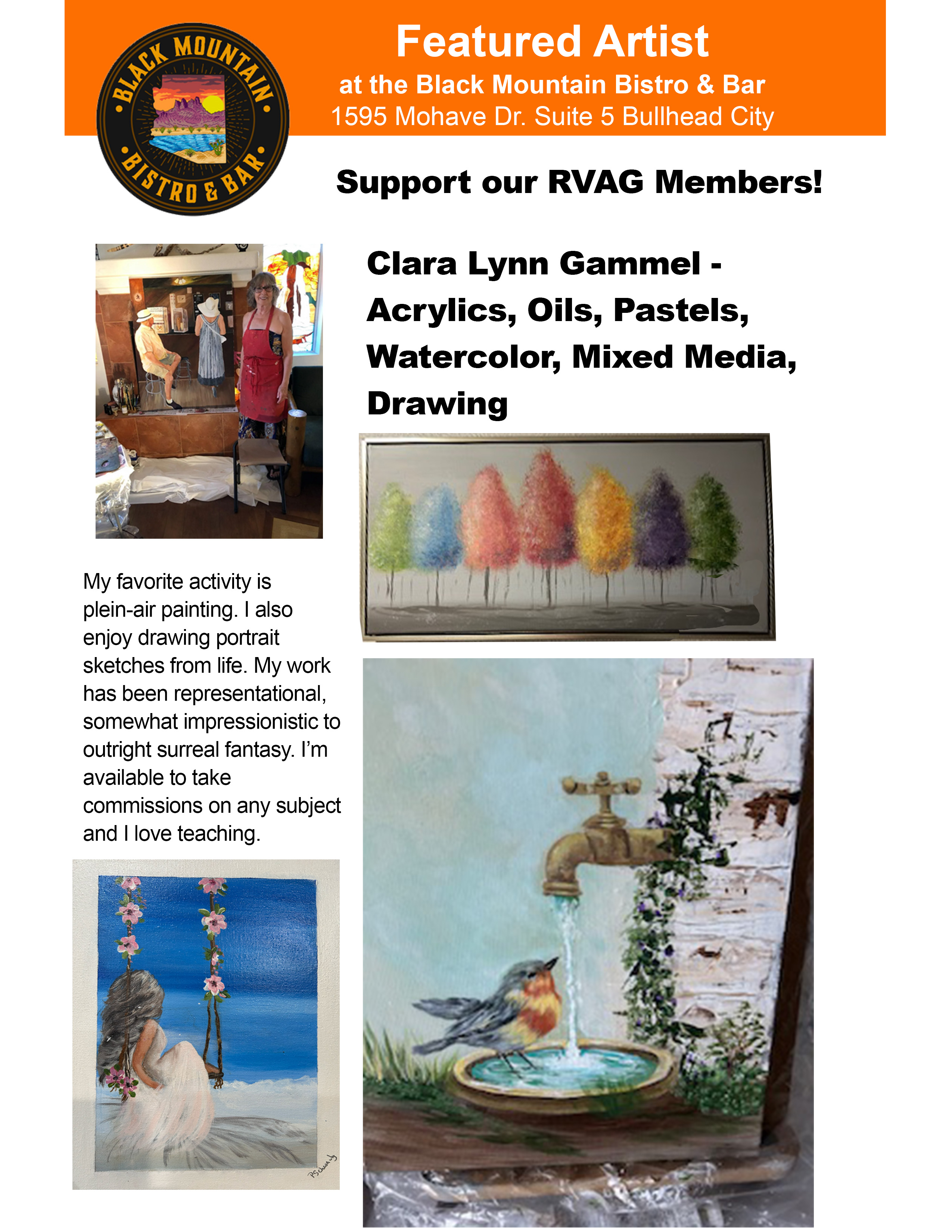 Join us at the Black Mountain Bistro for lunch on the 2nd Friday of each month at 11:30am. Everyone pays for their own meal and we can talk about art and get to know each other. You'll be able to see all the new art that is hung for that month.